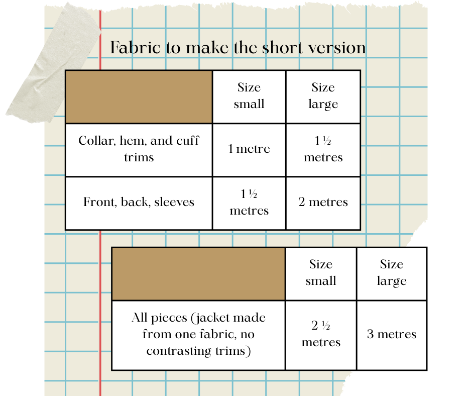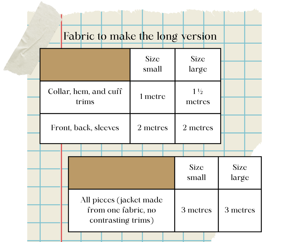 If you would like to buy your own fabric, check the amounts below, depending on length version and your size.